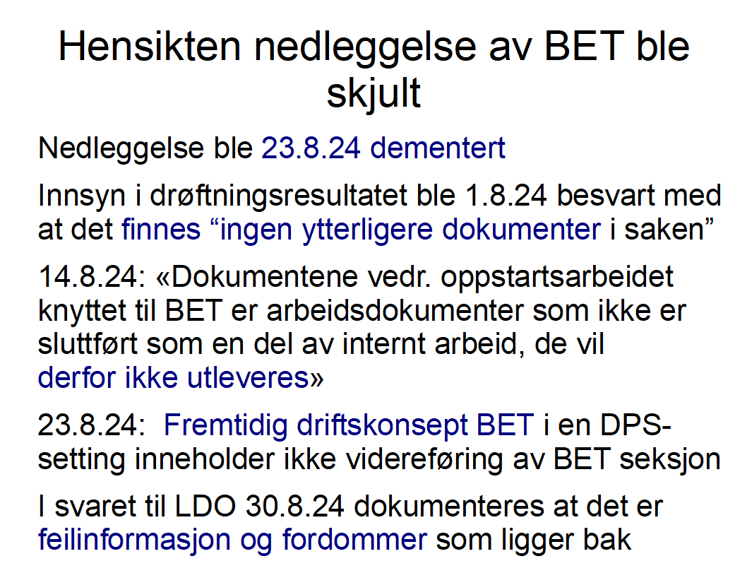 Presseoppslag "Blakstad sykehus har vedtatt å legge ned døgntilbudet ved BET-seksjonen" ble 23.8.24 dementert «medfører ikke riktighet at det er fattet en beslutning». Innsyn i drøftningsresultatet ble 1.8.24 besvart med «Det foreligger på nåværende tidspunkt ingen ytterligere dokumenter i saken». Innsyn i beslutningen å iverksette en konsekvensutredning ble besvart med «Dokumentene vedr. oppstartsarbeidet knyttet til BET er arbeidsdokumenter som ikke er sluttført som en del av internt arbeid, de vil derfor ikke utleveres». Nektelsen ble påklaget og 13.9.24 send til Helse- og omsorgsdepartementet som har spurt 19.9.24 om å oversende klagen. Fremtidig driftskonsept BET i en DPS-setting presentert i Vestre Viken styret 23.8.24 inneholder ikke videreføring av BET døgnavdeling. I svaret 30.8.24 til LDO dokumenteres at det er feilinformasjon og fordommer som ligger bak.