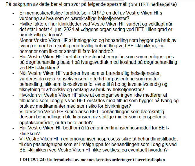 PS: LDO skriver 29.7.24 til Vestre Viken HF om "Undersøkelse av menneskerettsvurderinger i bærekraftsplan": Er menneskerettslige forpliktelser i CRPD en del av vurderingen av hva som er bærekraftige helsetjenester? Hvilke faktorer har klinikkleder ved Vestre Viken HF vurdert og vektlagt når det står i notat 4. juni 2024 at «dagens organisering ved BET i liten grad er bærekraftig videre»? Mener Vestre Viken HF at innleggelse og behandling som bygger på bruk av tvang er mer bærekraftig enn frivillig behandling ved BET-klinikken, for personer som ikke er ansett til fare for andre?